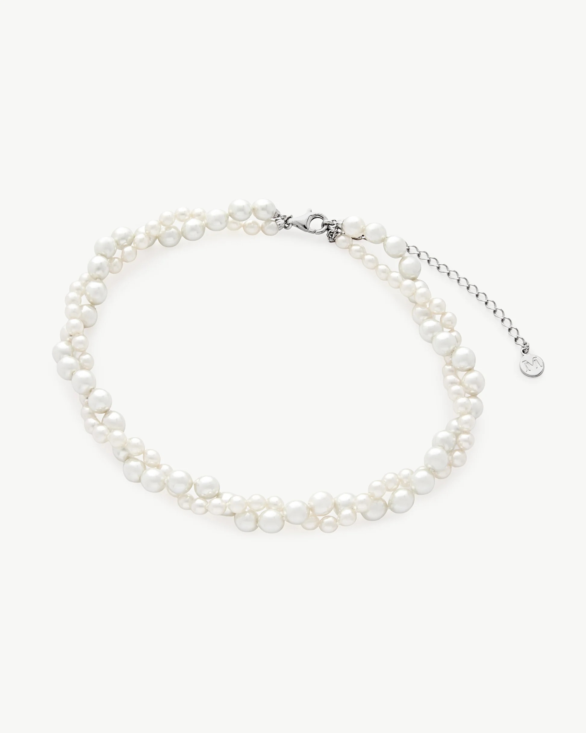 Gargantilla de perlas de dos vías de 32 cm de largo. Diseño elegante y versátil que se adapta a diferentes estilos y ocasiones. Creado con perlas artesanales redondas blancas de 4 y 6mm enfiladas y anudadas a mano.