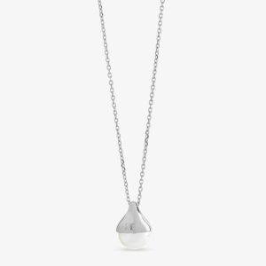 Collar de cadena, realizada en plata de Ley. La cadena tiene 40cm longitud, con un colgante de perla redonda blanca de 10mm., en forma de gota. EL collar tiene un alargador de 5cm. para ajustar la longitud de la cadena.