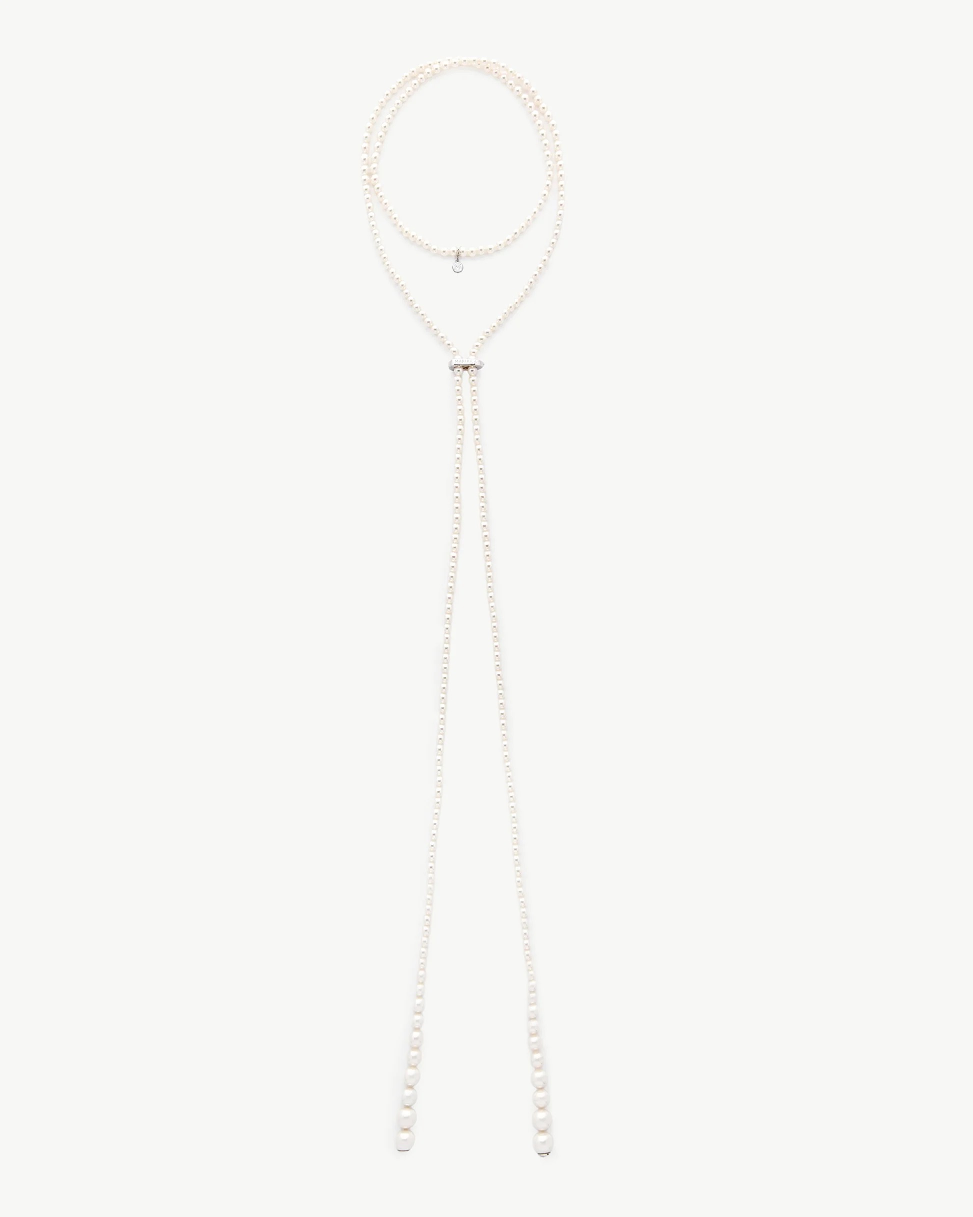 Collar de perlas largo de 130 cm de longitud y de diseño abierto. El collar está elaborado con perlas artesanales Majorica, redondas de color blanco, en tamaños graduados de 4, 5, 6, 7, 8 y 9mm. El collar está enfilado y anudado a mano. Incluye medalla y cierre ajustable de plata. El cierre permite colocar el collar en distintas posiciones. También puede ir anudado