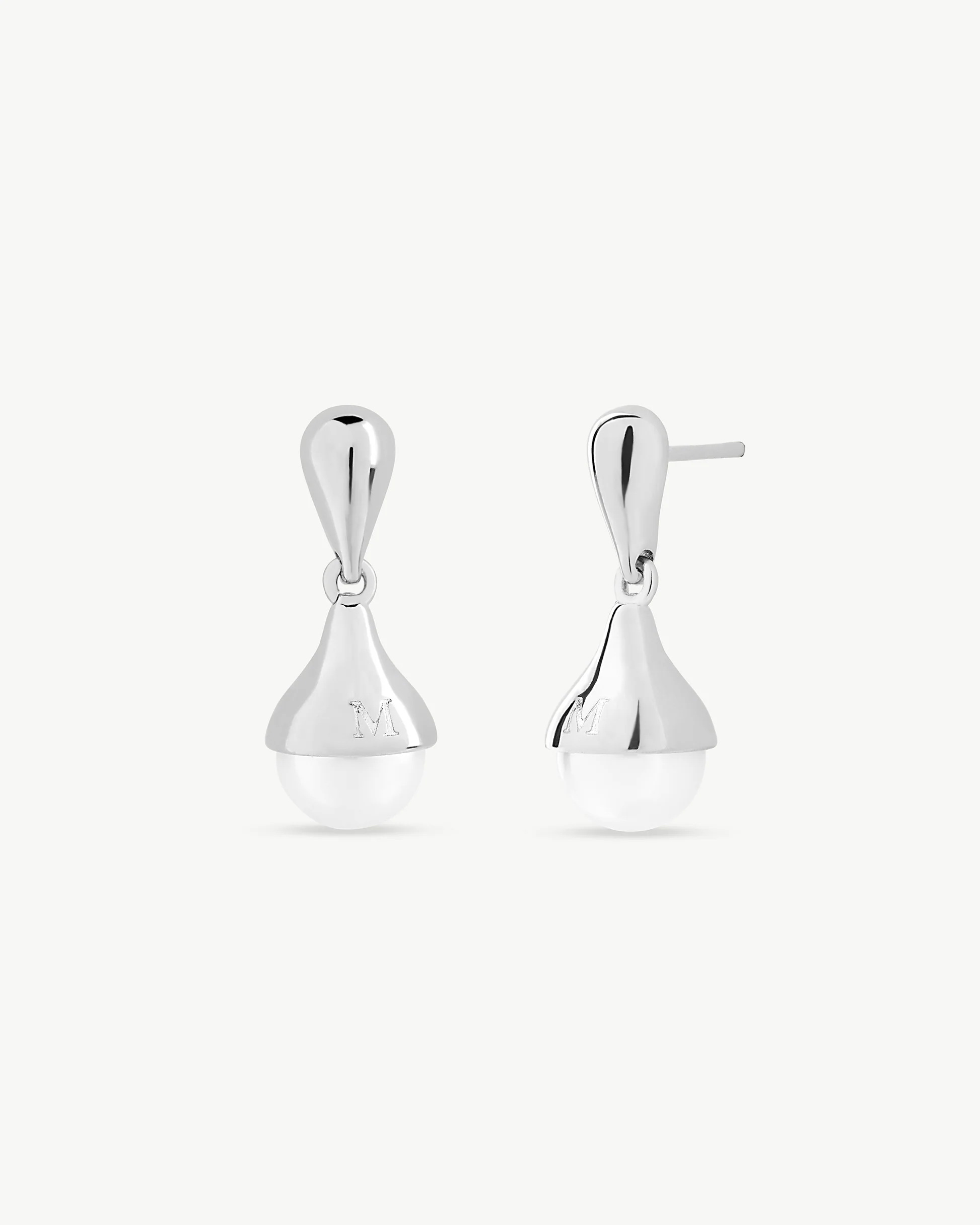 Pendientes cortos de 2.6cm de largo, realizados en plata de Ley con acabado rodiado para dar más brillo. EL diseño contiene una perla blanca redonda con forma de gota de 8mm. (tamaño de la perla).