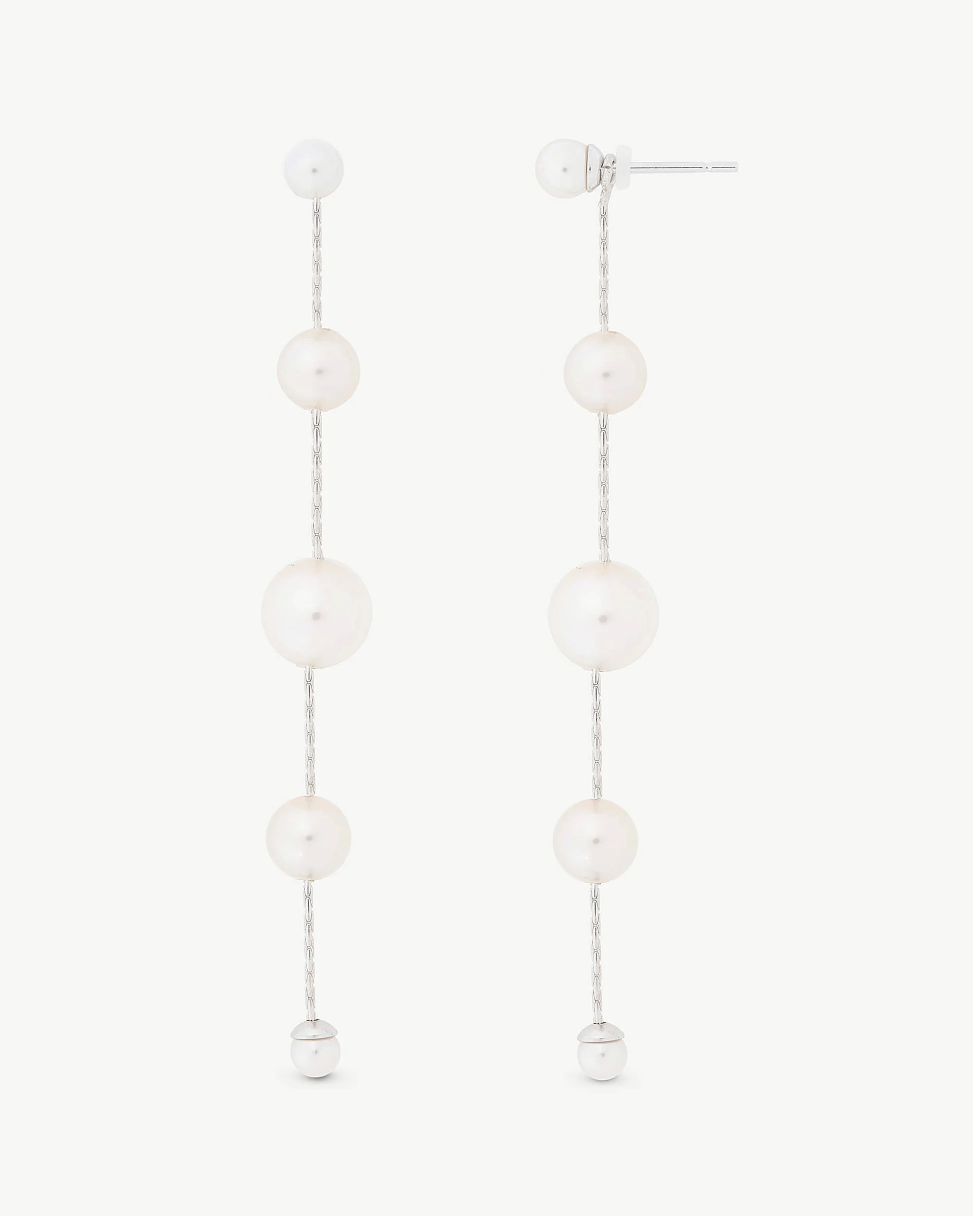 Pendientes largos de 7cm de longitud, en plata con perlas blancas redondas de 4, 6 y 8mm.