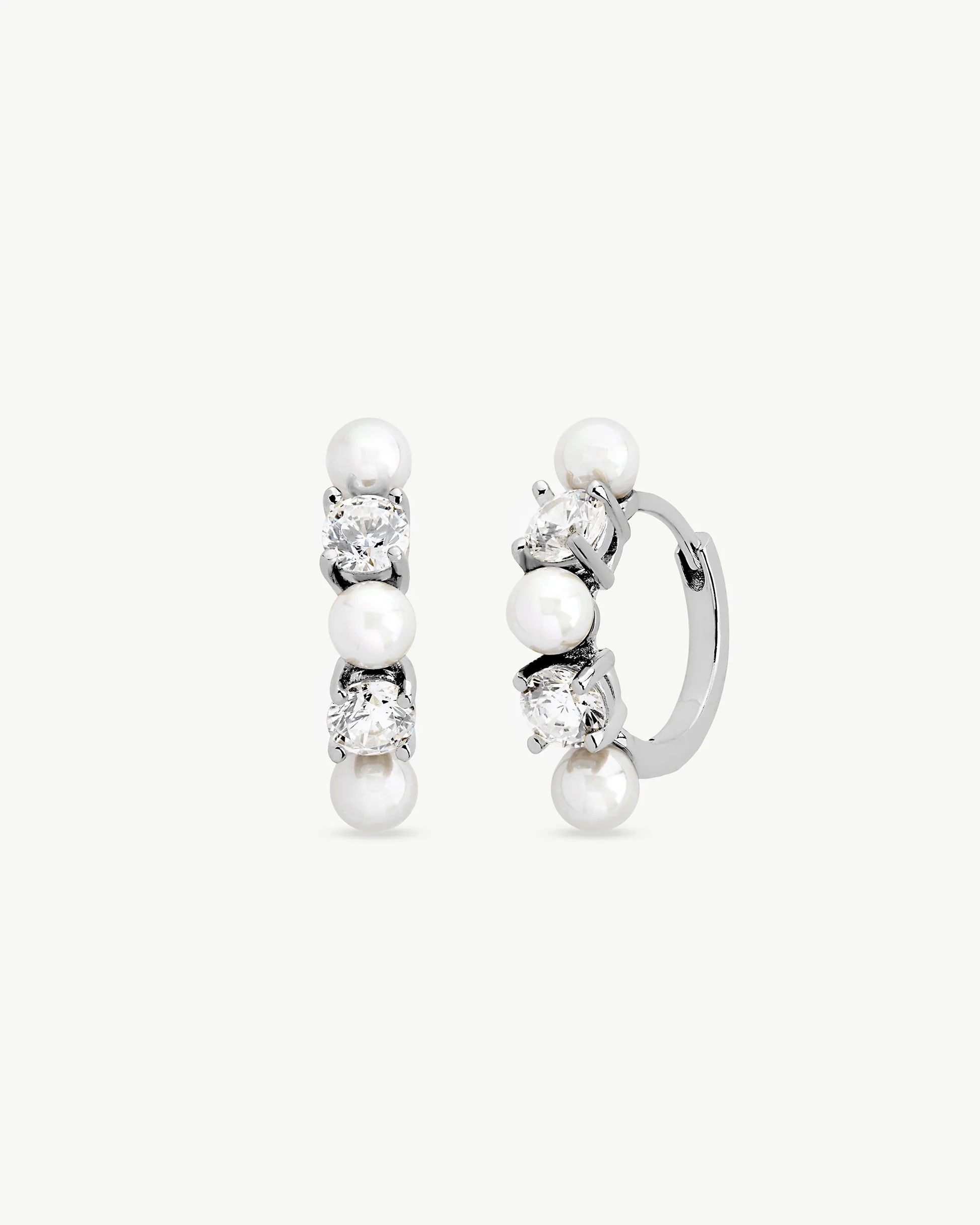 Pendiente de aro en plata rodiada con pincho y presión y con 3 perlas redondas blancas de 4mm y 2 circonitas.