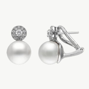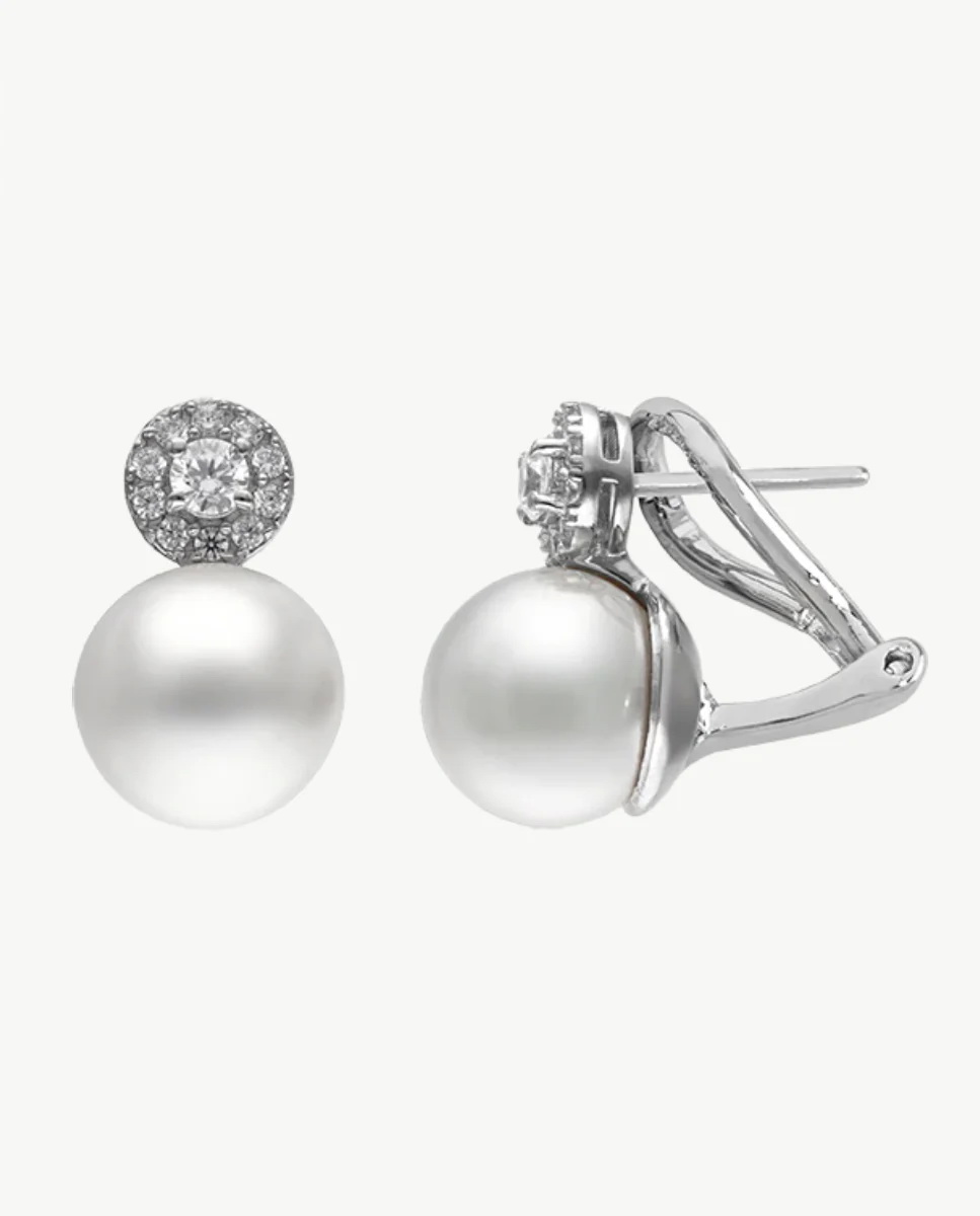 Pendientes en plata de cierre omega con rosetón de circonitas y perla redonda blanca de 10 mm.