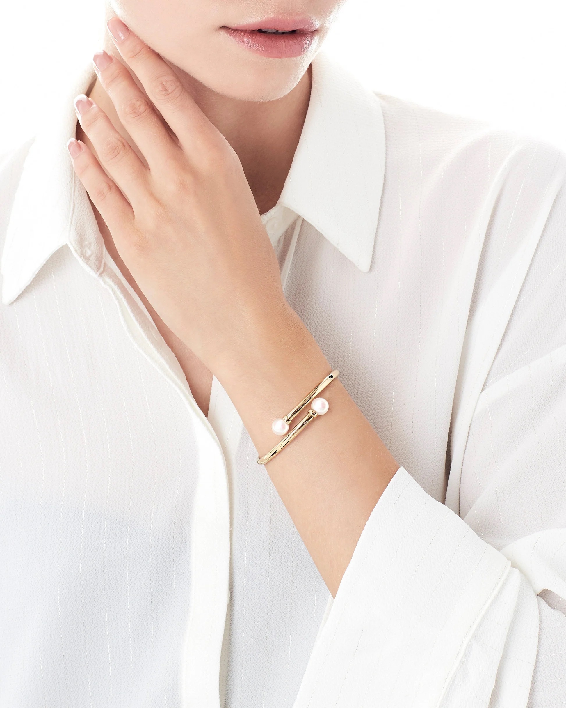 Brazalete rígido 5,8 cm oval en acero dorado, 9 mm perlas redondas blancas. Galatea, la colección de joyas realizadas en acero inoxidable, una declaración de tendencias.