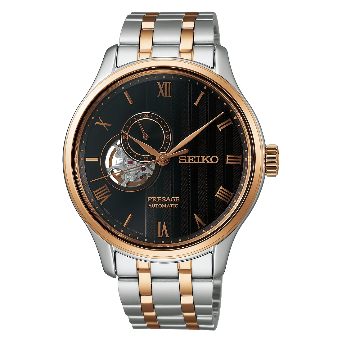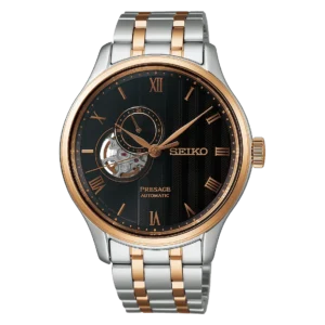 La ventana de corazón abierto a las 9 en punto muestra la belleza de la relojería japonesa de Seiko y el calibre automático de fabricación propia. El brazalete incluye un cierre desplegable.