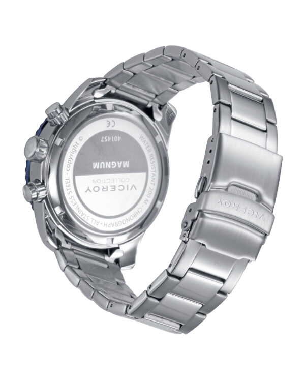 Robustez y estilo se combinan en este cronógrafo masculino con calendario, que luce una caja bitono de acero Ip azul con corona a rosca y resistencia de 20Atm. Su brazalete de acero aporta presencia, mientras la esfera azul con índices y las agujas en plata, junto a los contadores a las 3 y 9 y la aguja a las 6 con punta blanca, aseguran funcionalidad y precisión en todo momento.