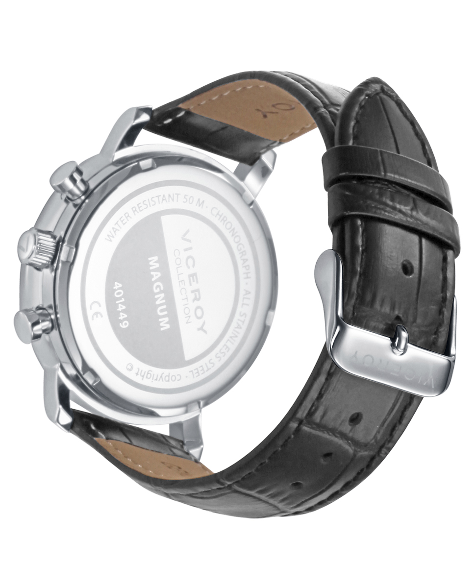 Con un estilo distinguido y contemporáneo, este cronógrafo masculino presenta caja de acero 5Atm, correa de piel negra y esfera azul con números árabes, mientras sus agujas horarias y contadoras y el cristal mineral aseguran funcionalidad y durabilidad para el día a día.