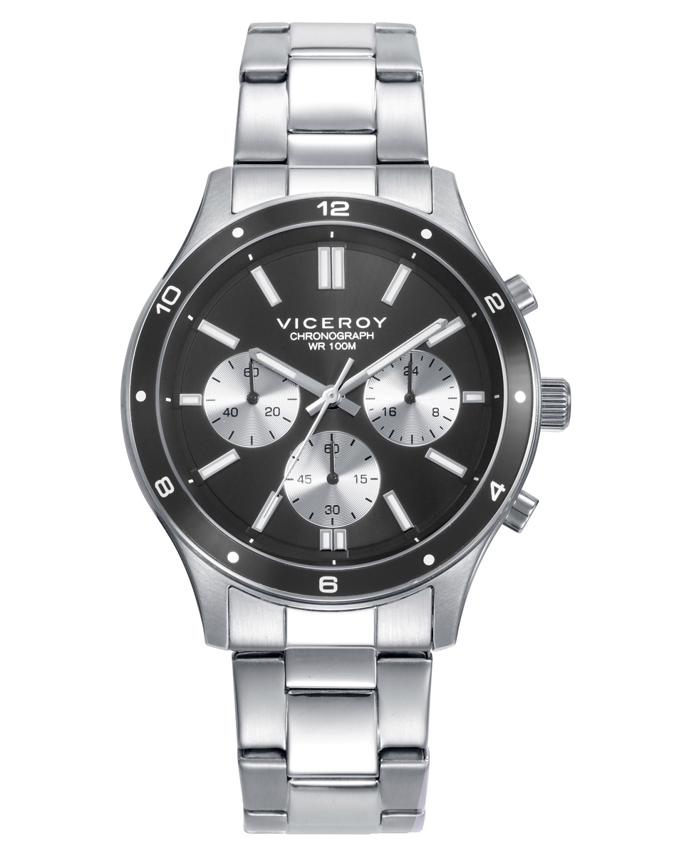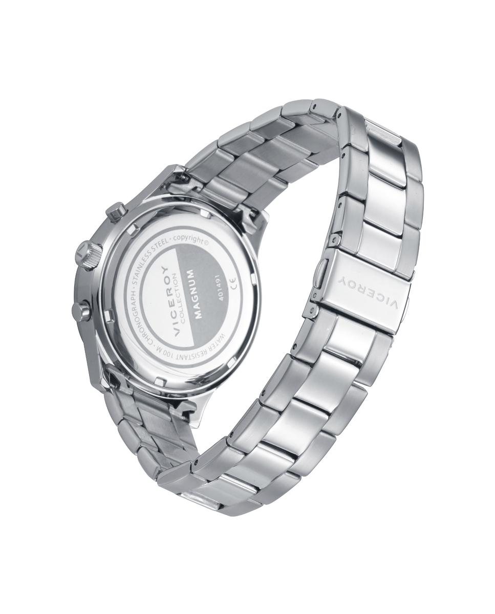 El reloj Viceroy de la colección Magnum 401491-57 se caracteriza por su estilo que se combinan en este cronógrafo masculino con calendario, que luce una caja de acero, resistente de 10 Atm. Su brazalete aporta estilo, mientras la esfera negra con índices plateados y las agujas plateadas, junto a los contadores a las 3 y 9 y la aguja a las 6 con punta blanca, aseguran funcionalidad y precisión en todo momento.