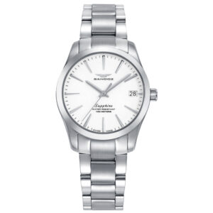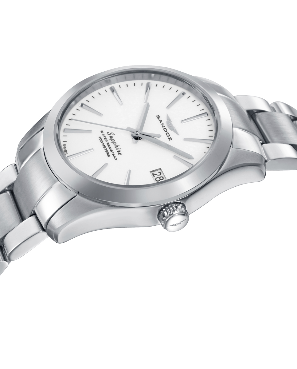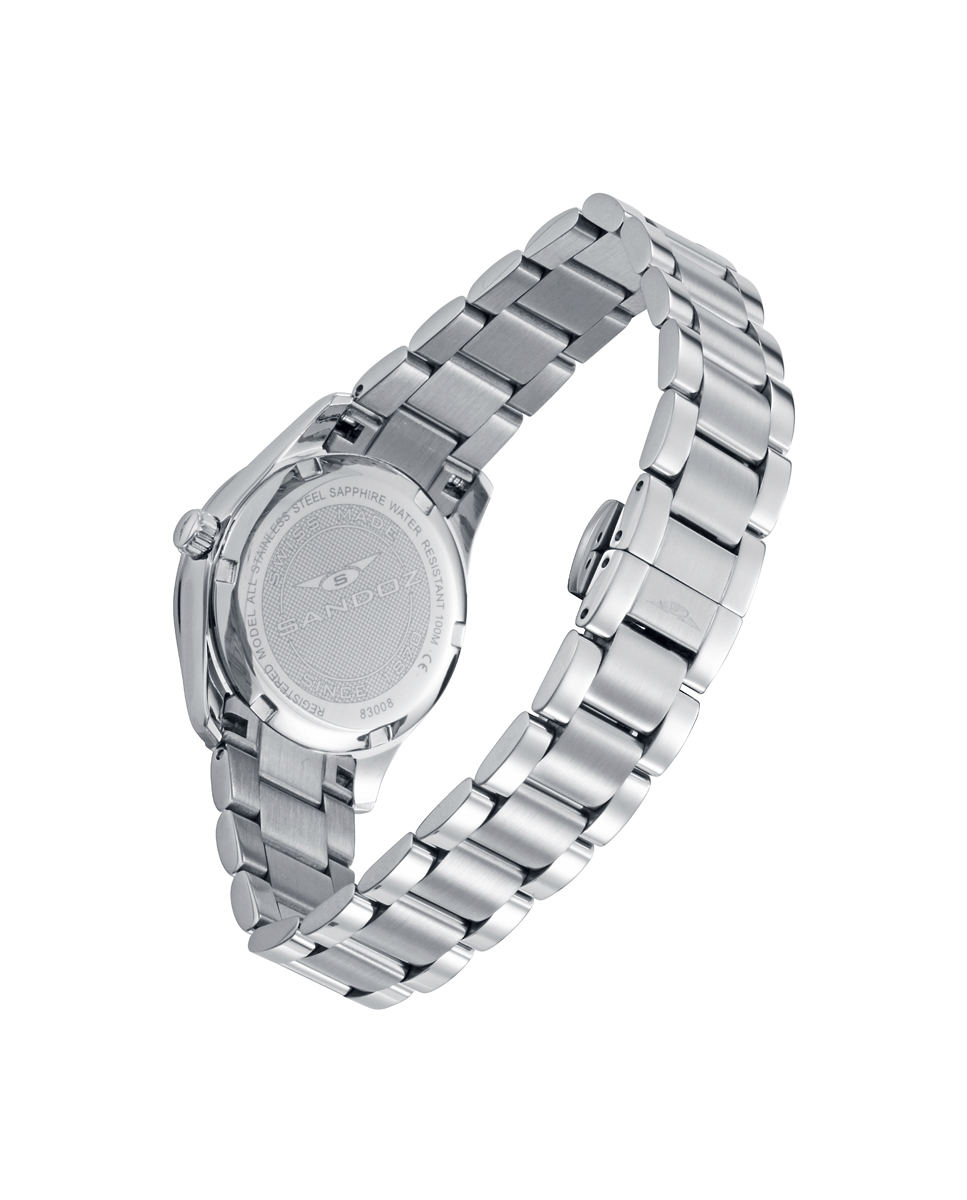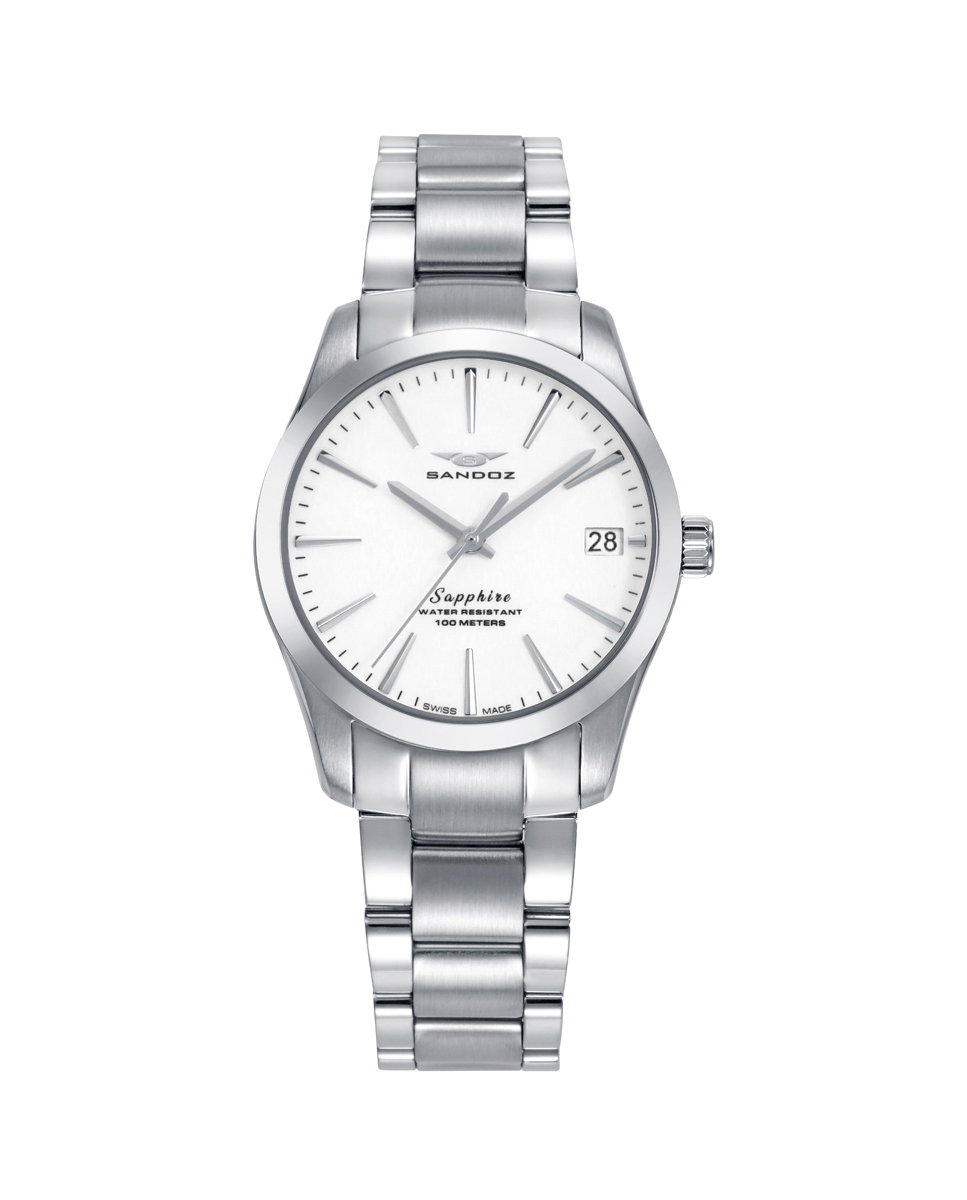 Reloj de Señora Sandoz 83008-07, tiene la caja de acero, la cadena es de acero sólido. El cristal es zafiro, el movimiento suizo cuarzo, y el display analógico.