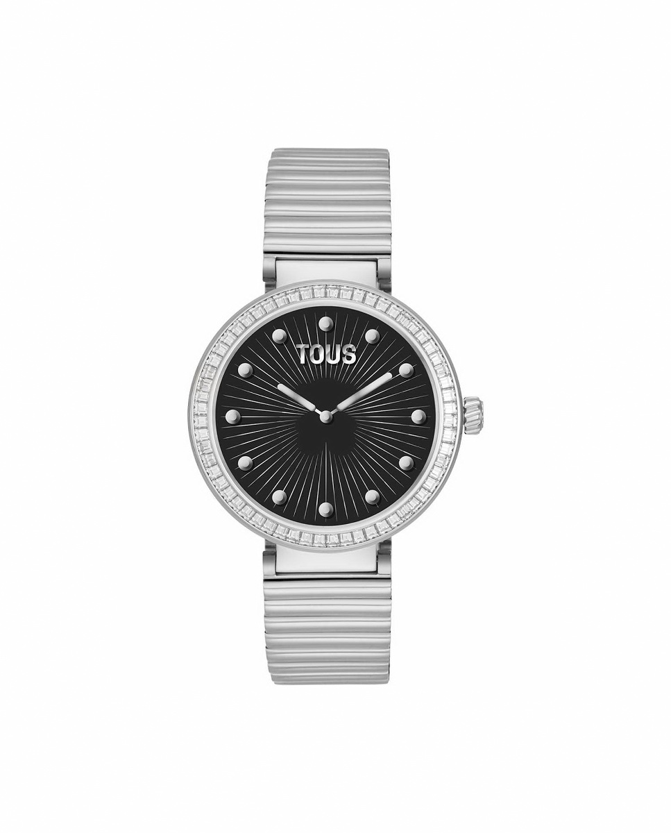 - Características Reloj: Funciones: 8 Esferas TOUS + 4 intercambiables desde la TOUS WEAR APP, horas, minutos, mes, día, día de la semana, actividad diaria con contador de pasos, contador de calorías y distancia recorrida en millas o kilómetros, deportes (caminar, correr, cinta, escalada, equitación, elíptica, yoga, fitness, remo, HIIT, spinning, bicicleta, tenis, cricket y saltar la cuerda), frecuencia cardiaca, monitorización del sueño, presión arterial (aproximación), oxígeno en sangre (aproximación), función ovárica, notificaciones (llamadas, WhatsApp, email, SMS, Facebook, Instagram, etc.), clima, cronógrafo 1/10 segundos, control música y control cámara.