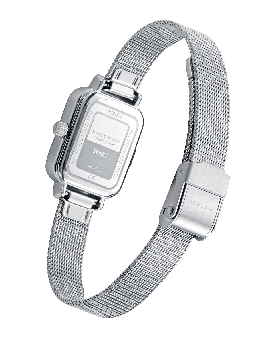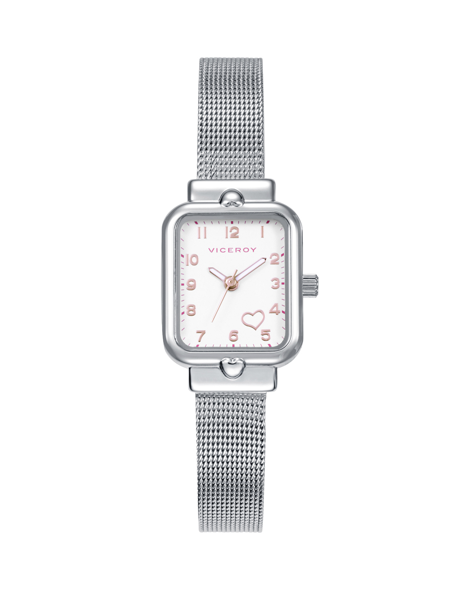 Niña Viceroy Sweet 401328-05, reloj tres agujas, caja y brazalete de acero esfera blanca y cierre con pulsadores que permite su ajuste a la muñeca.