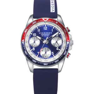 Reloj Niño Viceroy Next, 401463-34. Reloj caja de acero y bisel con indicadores horarios, esfera blanca, cadena acero, cronógrafo de niño. Pulsera de piel trenzada azul con placa de acero y detalles en esmalte de regalo.