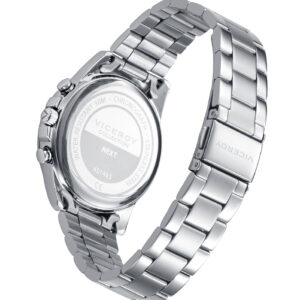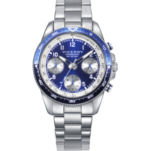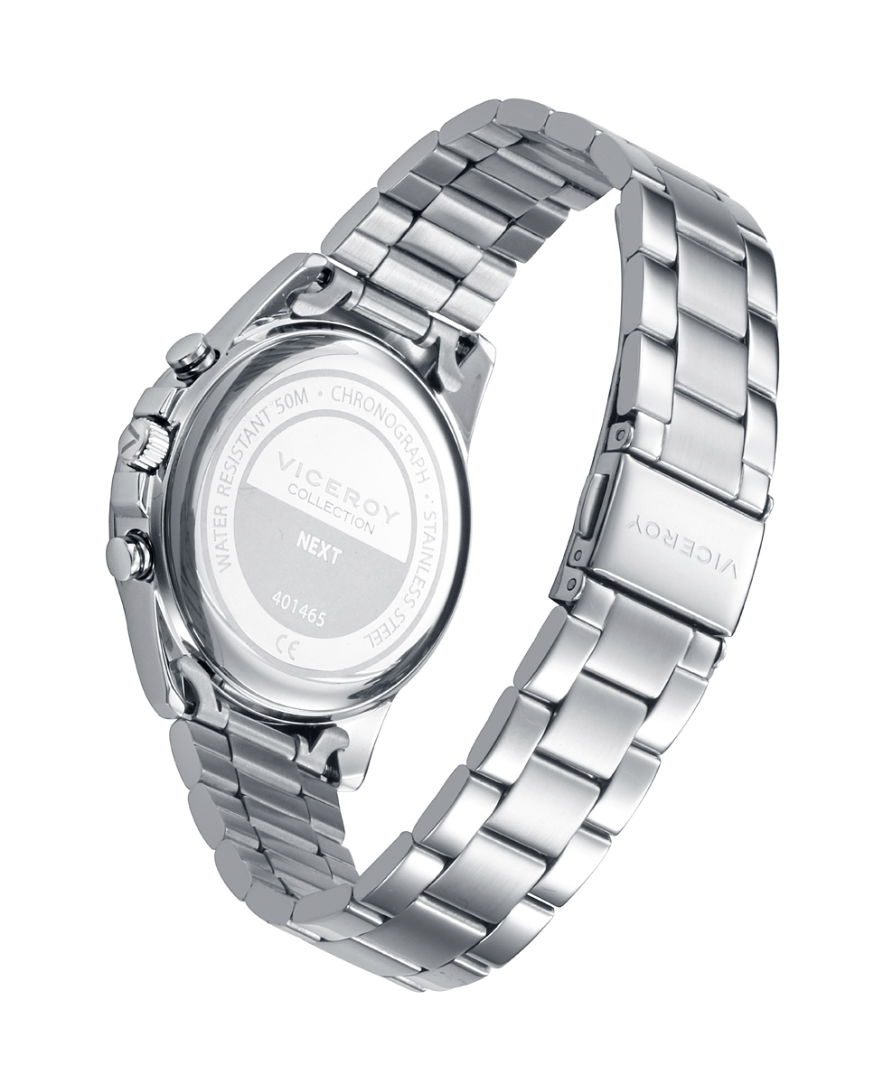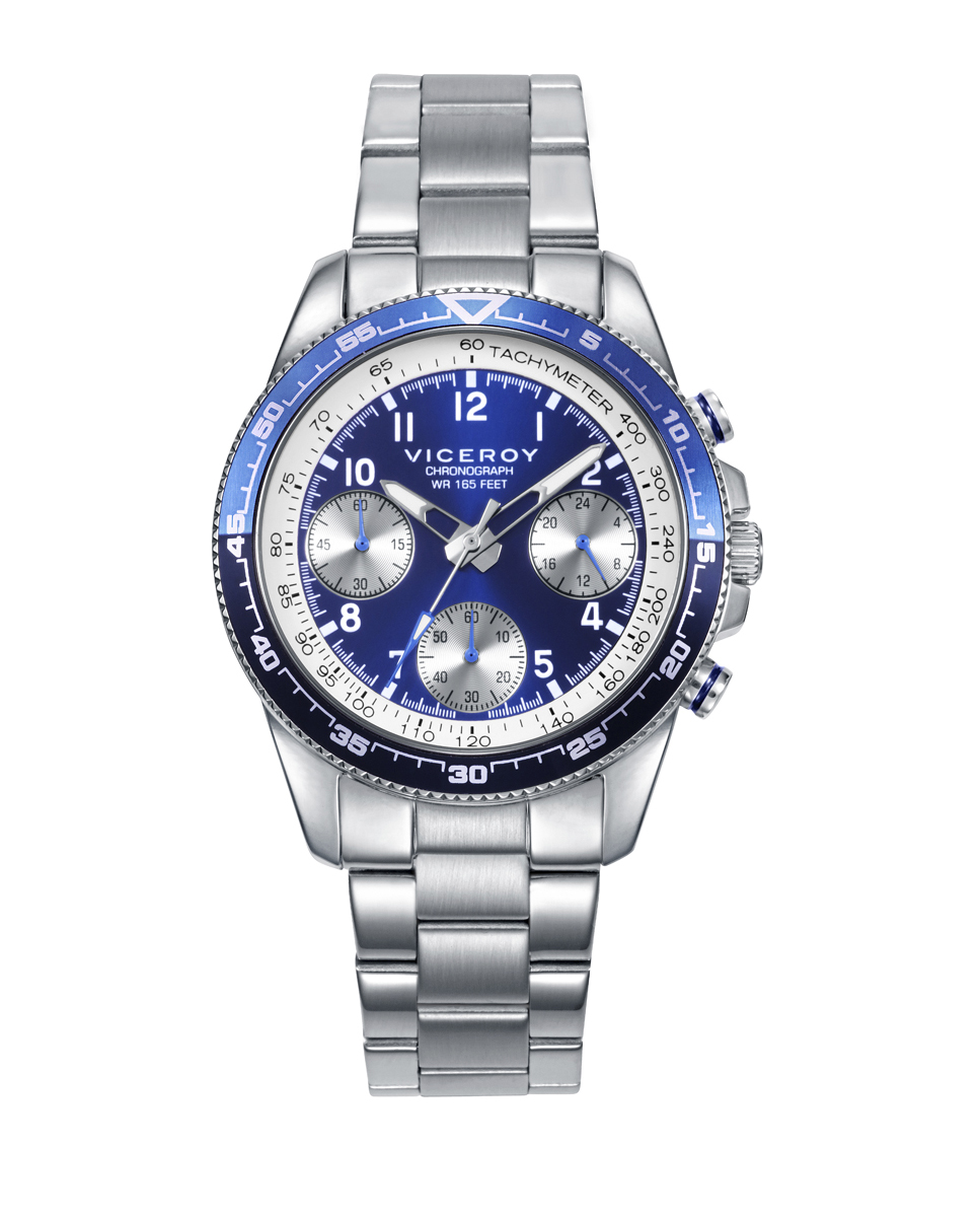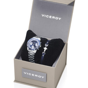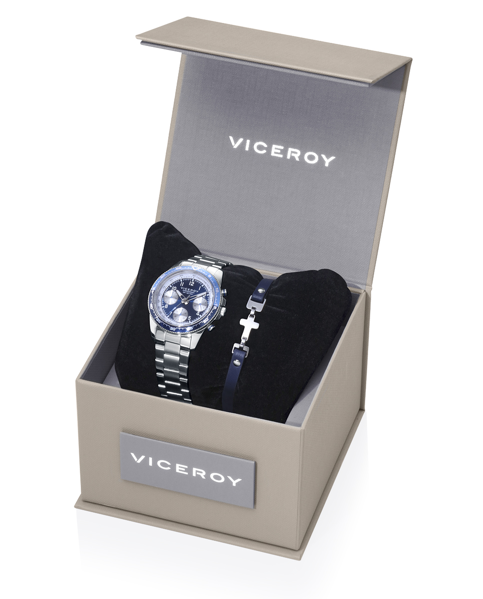 Reloj Niño Viceroy Next, 401465-34 Reloj caja de acero y bisel con indicadores horarios, esfera blanca, cadena acero, cronógrafo de niño. Pulsera de piel trenzada azul con placa de acero y detalles en esmalte de regalo.