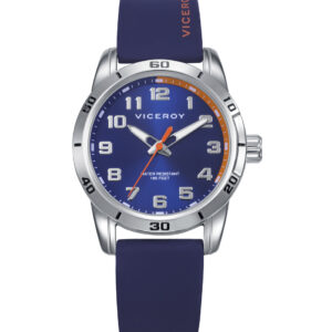 Reloj Niño Viceroy Next, 401465-35. Reloj caja de acero y bisel con indicadores horarios, esfera blanca, cadena acero, cronógrafo de niño. Pulsera de piel trenzada azul con placa de acero y detalles en esmalte de regalo.