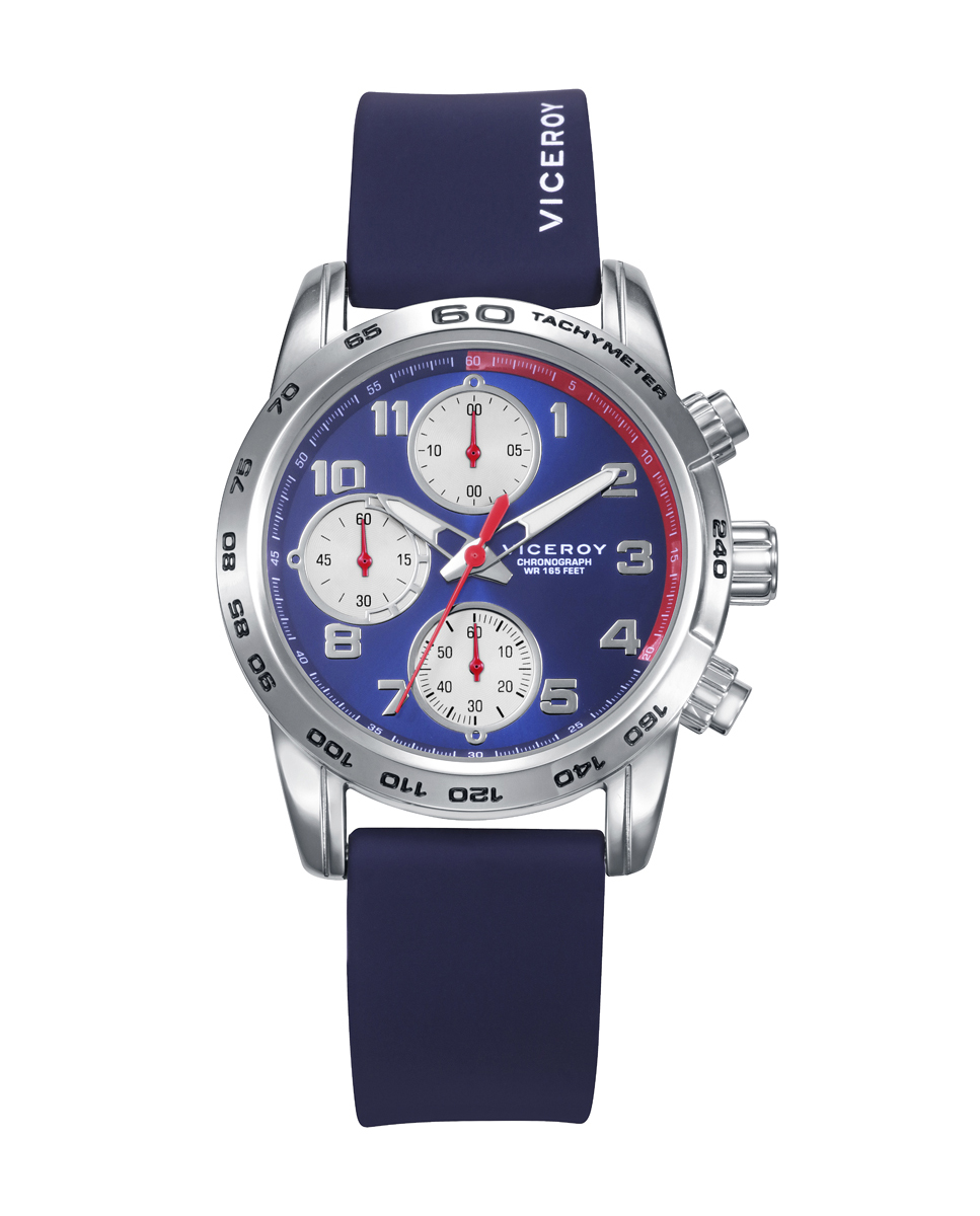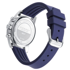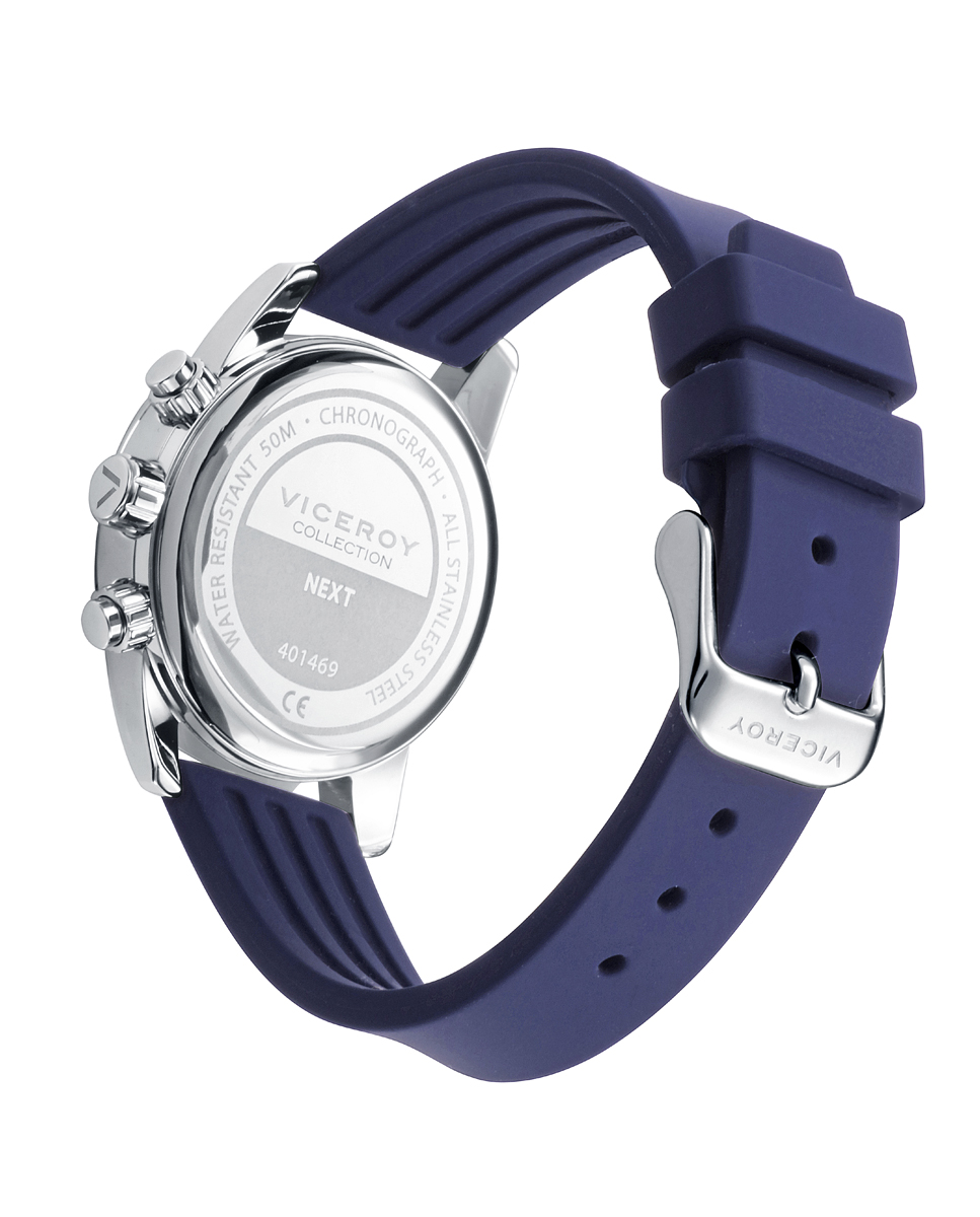 Reloj Niño Viceroy Next, 401469-35. Reloj caja de acero y bisel con indicadores horarios, esfera blanca, cadena acero, cronógrafo de niño. Pulsera de piel trenzada azul con placa de acero y detalles en esmalte de regalo.