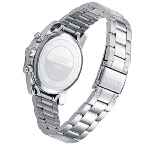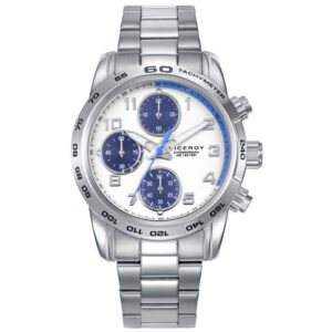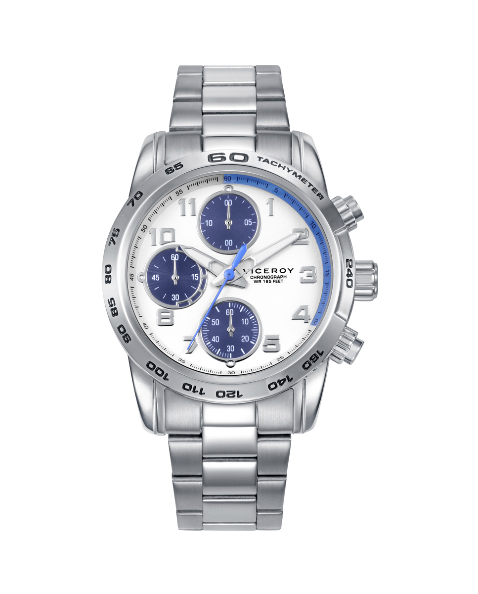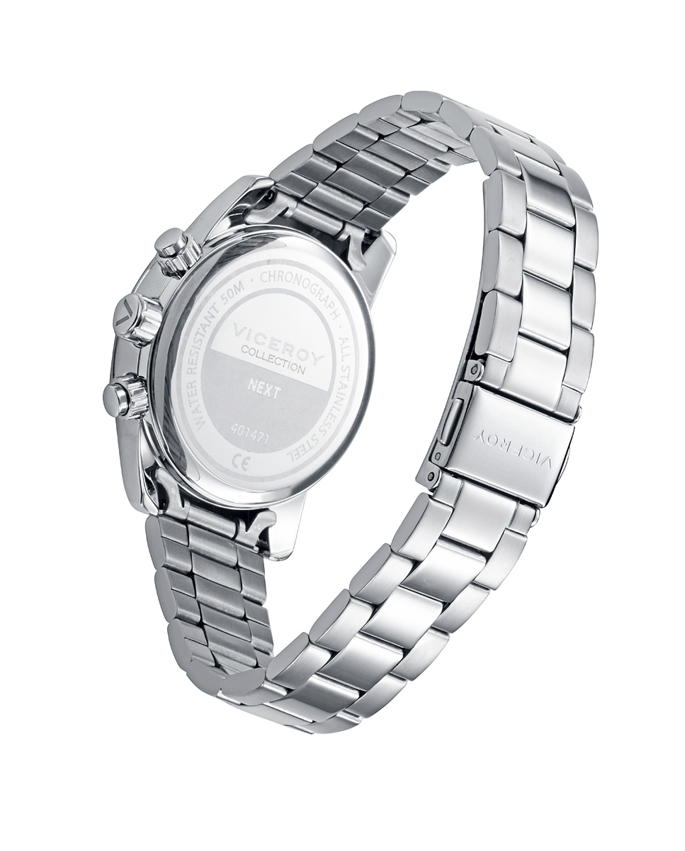 Reloj Niño Viceroy Next, 401471-05. Reloj caja de acero y bisel con indicadores horarios, esfera blanca, cadena acero, cronógrafo de niño. Pulsera de piel trenzada azul con placa de acero y detalles en esmalte de regalo.