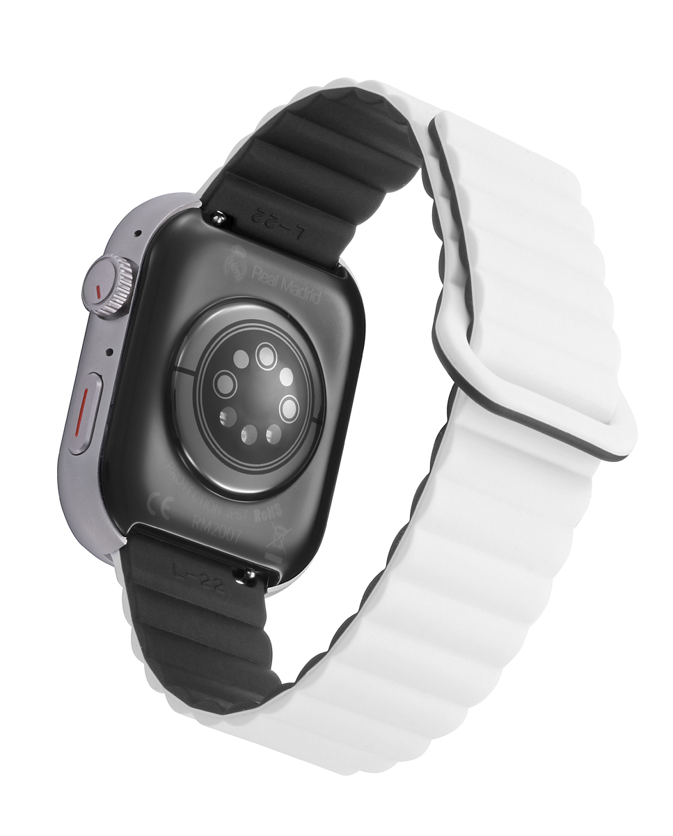 Smartwatch Real Madrid Smartnow, caja de metal y malla milanesa, pantalla táctil, Funciones, llamadas desde el reloj, notificaciones, mensajes, realizar llamadas, presión arterial, oxígeno en sangre, cuentapasos, distancia realizada, gestión de deportes, cronómetro, control de calidad de sueño, alarmas, control de cámara, localizar tu teléfono.